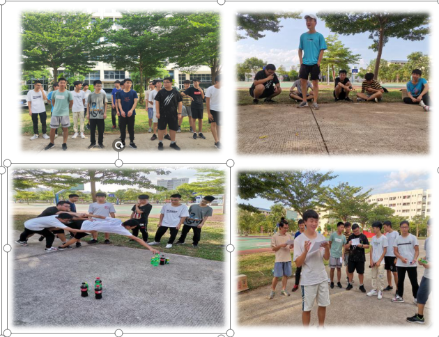 活动主要以素质拓展形式进行,将同学们分小组,完成活动挑战,崔建兵老师在旁指导,升华活动主题启发员工。做游戏,通过“大风吹”与“排排站”这两个活动使气氛变得活跃起来。同时安排了很多有助于团结配合的游戏,使同学们在训练中团结互助,从而达到与人交流目的,在轻松、相互信赖的团队气氛中体验成长,组数字(自己的代表的数字跟其他同学组成班助所报的数字和配合群龙取水等游戏考验同学们之间的配合,加强了同学之间的交流合作培养团队内部信任感。