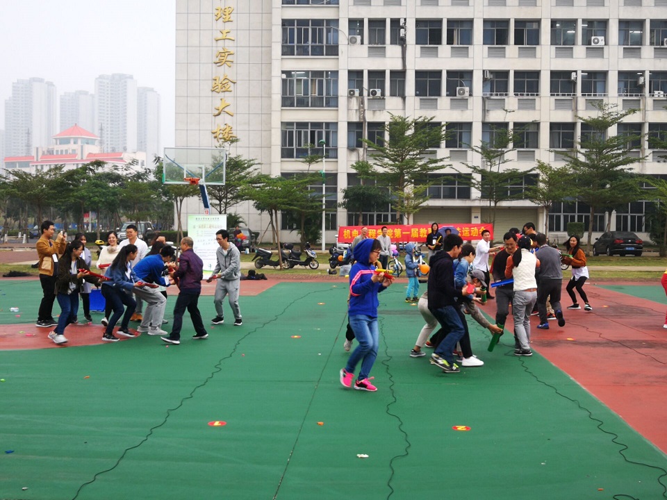 在老师们到场后,比赛正式拉开帷幕。老师们热情高涨,跃跃欲试,无论是慢骑自行车时的稳重、踩气球时的活跃、跳绳时的洒脱,还是团体赛时的默契,这些无不向我们展示着机电老师们的朝气蓬勃!在慢行的比赛项目中,各位参赛老师用尽浑身解数,排除其他老师的故意干扰,在保持身体平稳的前提下抵达终点,同学们的加油欢呼,老师的稳中向前,表现出比赛的趣味。踩气球赛时更是全体动员,老师与同学们使用了不少“战略”,比如声东击西,攻其不备,联手作战等。尤其是幼儿组,不少偷袭的行为更是令众人捧腹大笑。团体赛项目中,老师们团结一心、紧密配合,无论是“同舟共济”向前走时的同步一心,还是传递呼啦圈的紧张有趣、众志成城,都充分发扬了老师们团结协作的精神,赛场上所有成员齐心协力,欢呼声、欢笑声,此起彼伏。尽管天公不作美,中途天上飘着蒙蒙细雨,但比赛的喜悦早已将它忘去。