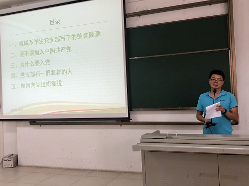 支部书记崔建兵老师从入党选择、入党动机等方面做了详细介绍,希望大家端正入党动机,积极向党组织靠拢,深刻把握时代发展要求。同时,也对18级新生们的老员工活提出美好希冀,期望同学们乐观向上,加强身体锻炼,做一个全面发展的老员工。