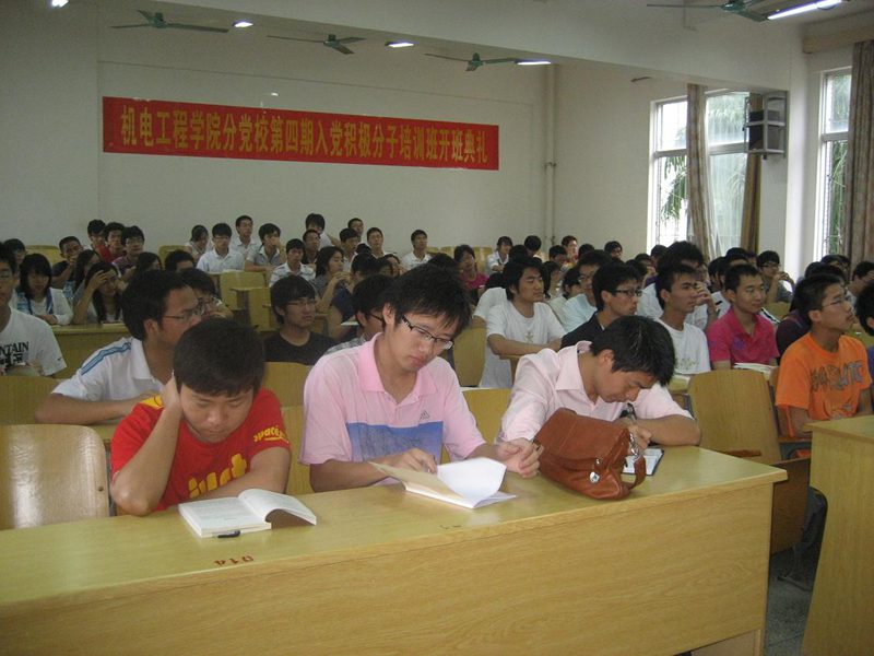 简洁的开班仪式后,黄书记满怀激情地走上讲台,开始培训班第一堂课《如何以实际行动争取入党》,他与学员们畅谈起中国共产党艰苦而卓越的发展历程,讲述了无数共产党员为中国革命所做的光荣事迹。以此号召参加培训的同学加强自我修养,严格自律,以自己的实际行动向党组织靠拢。同时,希望每位同学都要端正入党动机,珍惜学习机会,自觉学习党章、贯彻党章、拥护党章;坚持用党员的标准要求自己,立足自我,扎扎实实做好本职工作。课堂上,每位同学都聚精会神的听着讲座并不时地做着笔记。