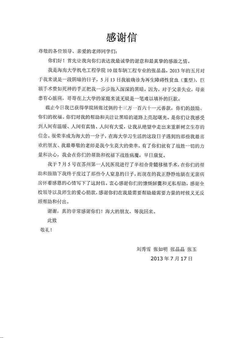 张晶晶及家人感谢信