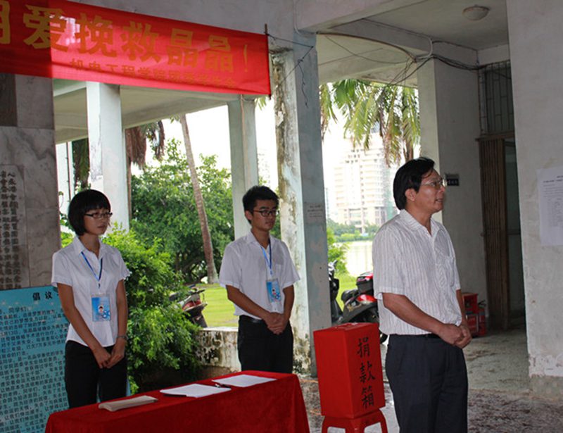张晶晶同学,是一名活泼开朗,积极努力,品学兼优的员工,5月份被确诊为重型再生障碍性贫血,需要进行骨髓移植手术,而高昂的手术医疗费给她和她原本艰难的家庭以精神上和经济上的双重打击。海大师生向无助的张晶晶同学伸出了援手。 大爱无疆:爱心在校园内传递