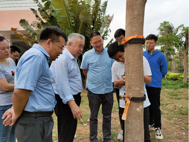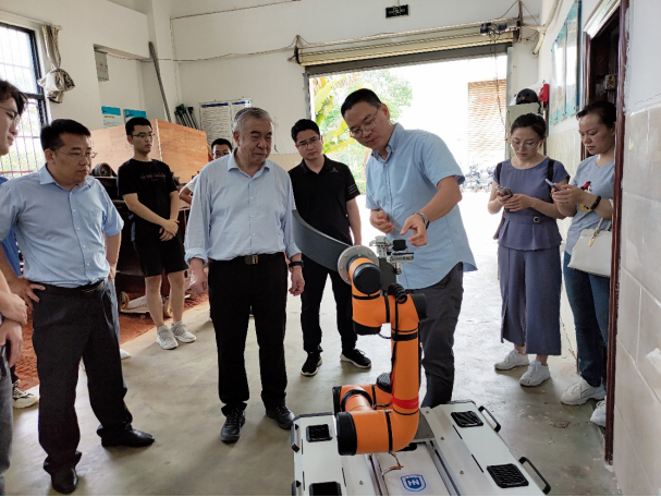座谈会后,陈学庚院士参观了公司农机实验室,张喜瑞教授对农机团队的科研情况进行了汇报和实机展示,着重介绍了智能化割胶装备的研发进展,陈学庚院士肯定了农机团队的工作,并就展示的两种割胶装备提出了改进方案。