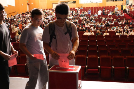 选举投票工作第二项,由工作人员分发选票,在场选民根据主持人讲解的流程认真填写信息并在选票上为所信任的候选人标上同意符号。选民填写完毕有序上台走到投票箱前,郑重投下自己的选票。