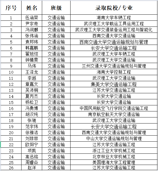 又是一年毕业季,2022年研究生复试录取工作已经接近尾声,伟德国际1946考研喜报频传,其中,2018级交通运输本科毕业生录取情况喜人,交通运输班共有应届生51名,有26人保研或者考研成功,考研录取率为50.98%,较2021年同比增长19.98%。其中有20人被湖南大学、南京航空航天大学、西南交通大学等“双一流”高校录取为硕士研究生。