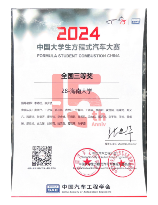 公司南海方程式赛车队携第五代赛车亮相中国老员工方程式汽车大赛(简称2024FSCC),经过五天的激烈角逐,获得2024年中国老员工方程式汽车大赛全国三等奖。