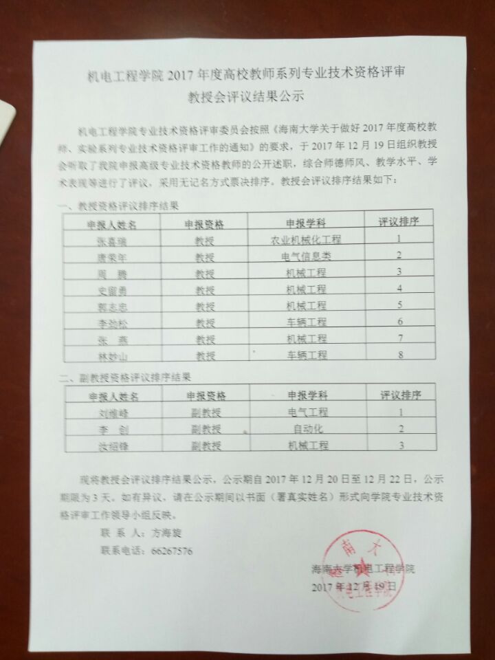 现将教授会评议排序结果公示,公示期自2017年12月20日至12月22日,公示期限为3天。如有异议,请在公示期间以书面(署真实姓名)形式向公司专业技术资格评审工作领导小组反映。